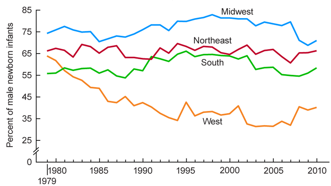The chart above shows the % of male newborns undergoing the procedure.